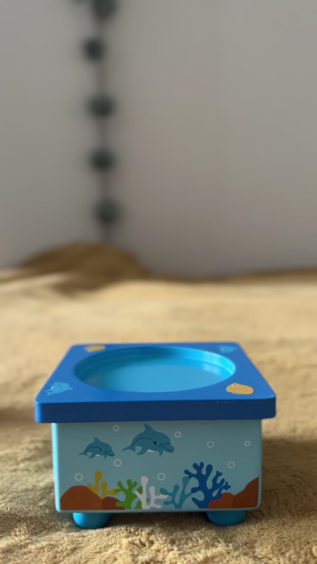 Il te suffit de remonter le mécanisme qui se situe en dessous pour entendre la si jolie mélodie de "By the beautiful Sea" de Harry Carroll. Pour faire encore plus briller les yeux de ton enfant, les dauphins se mettent à danser sur la piste!